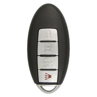 Your 2008 Infiniti M45 uses a smart key with 4 buttons on the face, a CR2032 battery inside powering the wireless communication, and a high-security emergency blade tucked inside the fob body. That blade slides out when the fob battery dies and you need to physically open the door. There's also a transponder chip that talks to the IMMO module every time you press start.